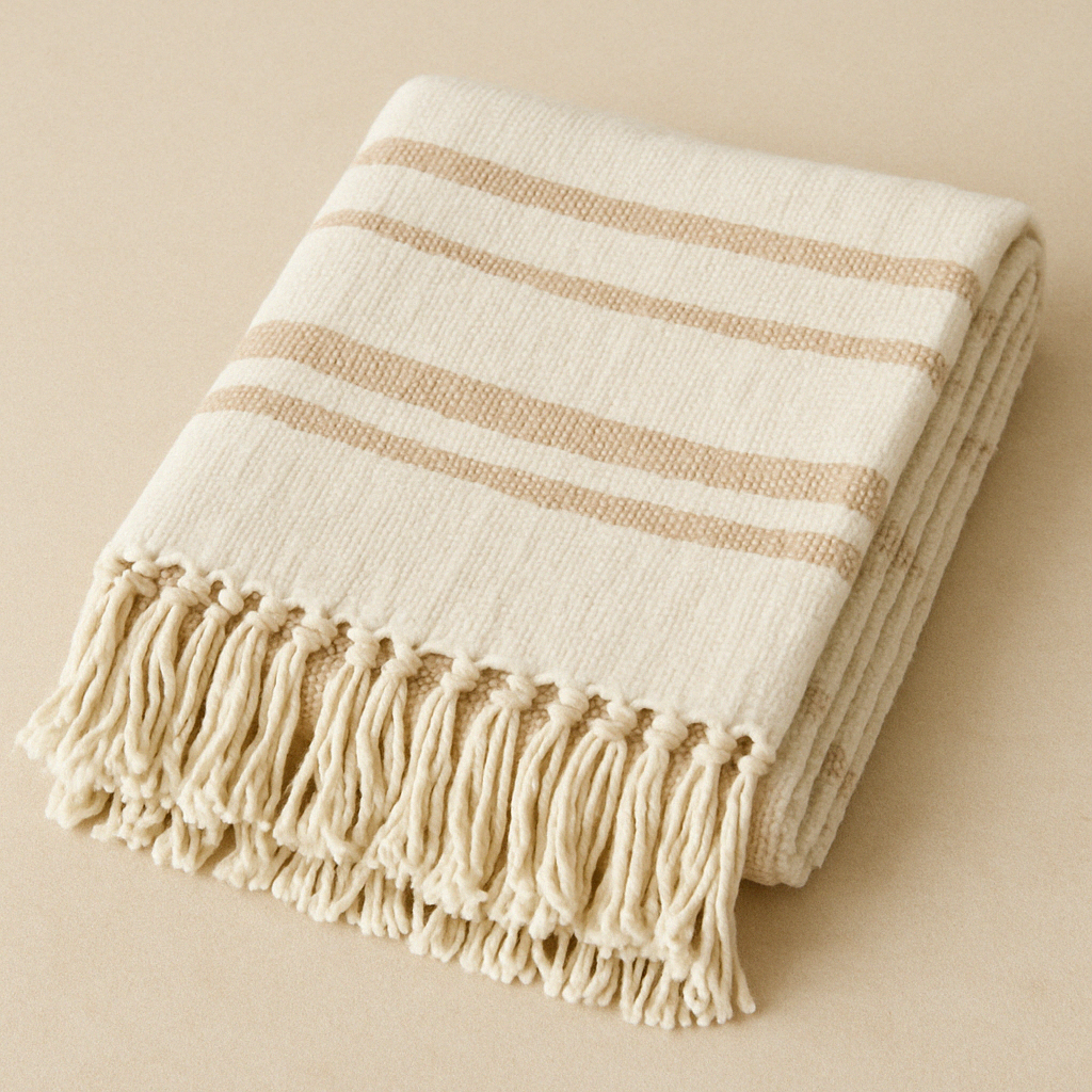 Manta ligera de algodón con rayas beige y flecos. Ideal para noches frescas en el jardín.